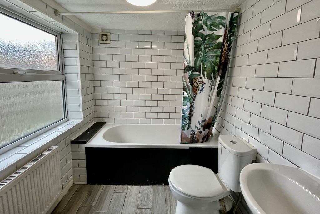 BATHROOM Continuation of grey ceramic floor tiles, panelled bath with mixer taps and wall mounted handheld shower attachment, fully tiled walls, push button WC, pedestal sink with mixer taps, towel rail, radiator, extractor, double glazed privacy window to rear aspect.