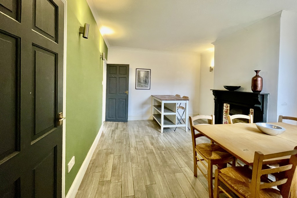 DINING ROOM Grey ceramic tiled flooring, radiator, under stairs storage cupboard, double glazed window to rear aspect with curtains, feature fireplace, wall sconces.