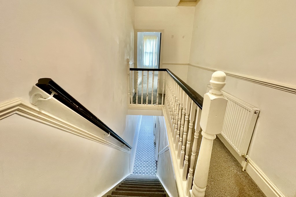 STAIRS AND LANDING Carpeted stairs and landing, handrail, smoke alae, pendant ceiling light.