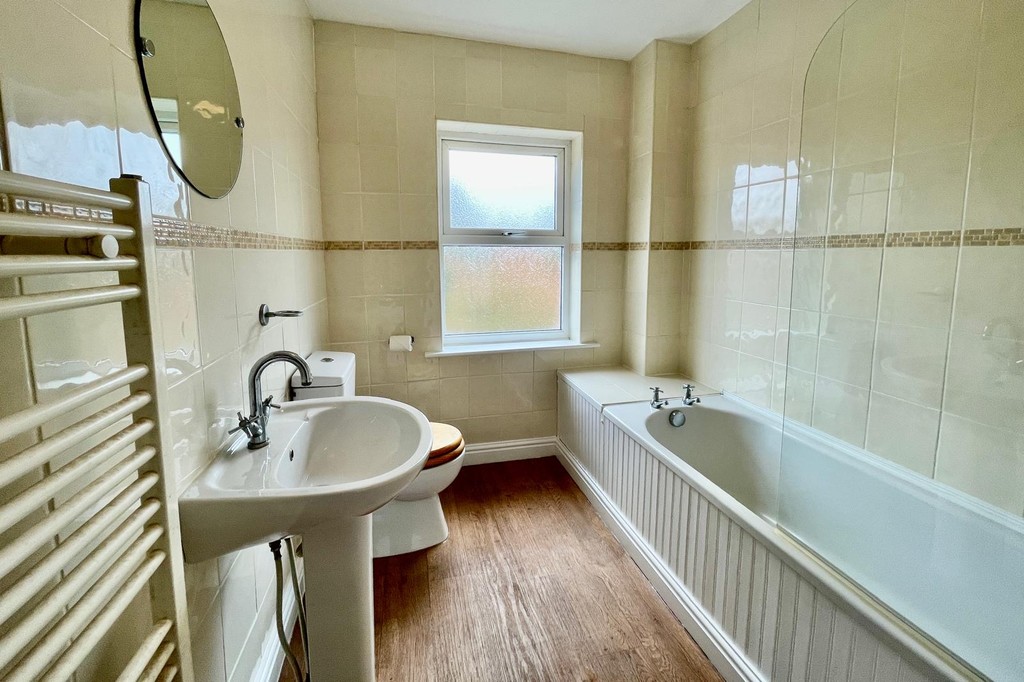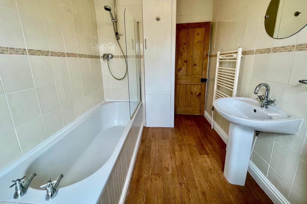 BATHROOM 6' 8" x 2' 7" (2.04m x 0.79m) Vinyl flooring, heated towel rail, pedestal sink with mixer tap, push button WC, wall mirror, fully tiled walls, paneled bath with glass screen, classic taps and wall mounted shower, storage cupboard with shelves, double glazed privacy window to rear aspect, ceiling light.