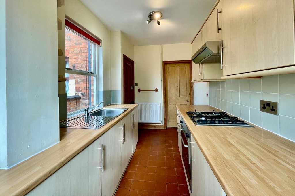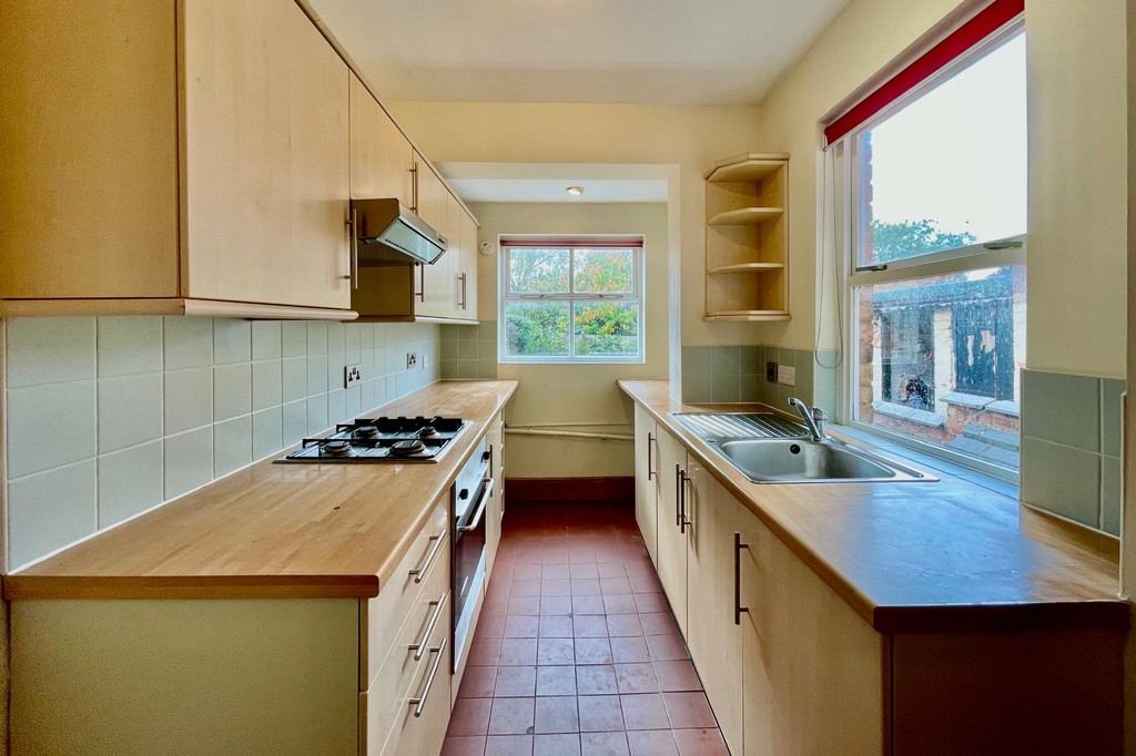 KITCHEN 13' 1" x 6' 5" (4.01m x 1.98m) Tiled flooring, light wood effect wall and base units with laminate worktops, wine rack, 4 ring gas hob, single bowl sink with drainer, mixer tap, 1/2 tiled walls, carbon monoxide alarm, boiler, radiator, 2 x's double glazed windows to rear and side, aspect, 3 bar ceiling light, wooden door to garden access.