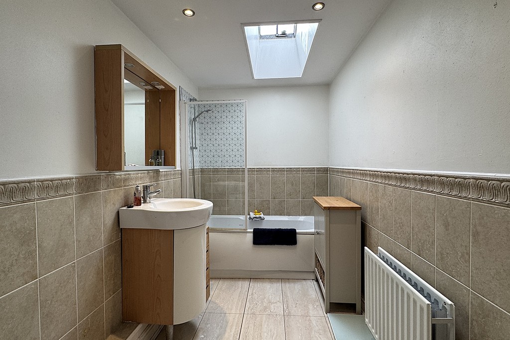 BATHROOM 13' 5" x 5' 10" (4.11m x 1.78m) A bright and modern bathroom featuring a Velux ceiling window and a crisp white three‑piece suite comprising a low‑flush WC, a vanity wash hand basin and a panelled bath with an independent shower and screen above. Tiled splash backs and a tiled floor create a clean, contemporary finish, complemented by ceiling downlights and an extractor fan for ventilation.