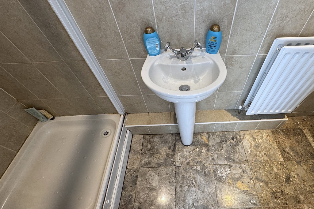 ENSUITE 2' 9" x 10' 2" (0.86m x 3.10m) A stylish en‑suite fitted with a crisp white three‑piece suite comprising a low‑flush WC, pedestal wash hand basin and an independent shower cubicle with tiled splash backs. The space feels bright and contemporary, enhanced by ceiling downlights, a tiled floor and an extractor fan for ventilation