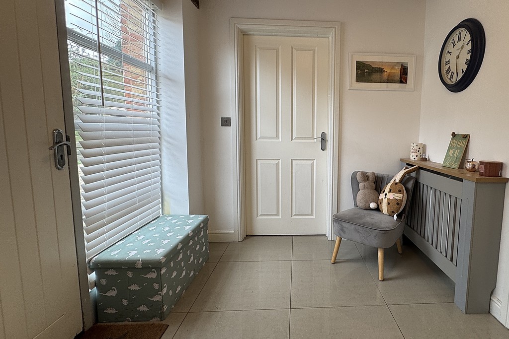 REAR LOBBY 4' 5" x 7' 10" (1.35m x 2.39m) A charming rear lobby with glazed French doors opening directly onto the rear patio, creating an easy indoor‑outdoor flow for everyday living. Exposed beams add character, while the tiled flooring is both stylish and practical. There's ample space for coats, boots and shoe storage, making it the perfect drop‑zone for busy households.