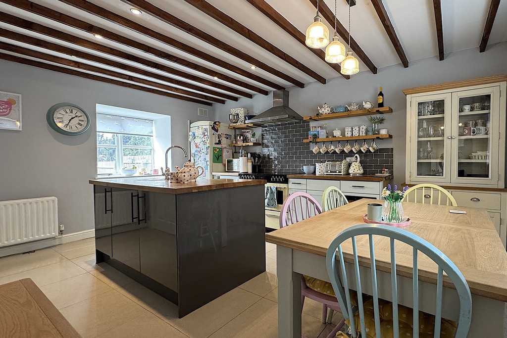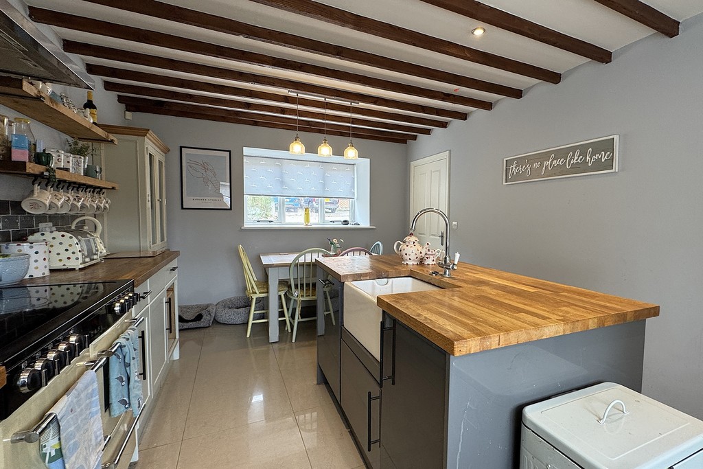 KITCHEN/DINER 18' 10" x 11' 3" (5.75m x 3.45m) An impressive dual‑aspect room with windows to both the front and rear, enhanced by exposed ceiling beams and ceiling downlights. The kitchen is fitted with a comprehensive range of eye‑level and base units, complemented by a central island, wooden work surfaces and tiled splash backs. Features include a Butler‑style sink, space for a range cooker with a stainless‑steel extractor hood, and space for a fridge‑freezer. The room is finished with a porcelain‑tiled floor and a door leading to;