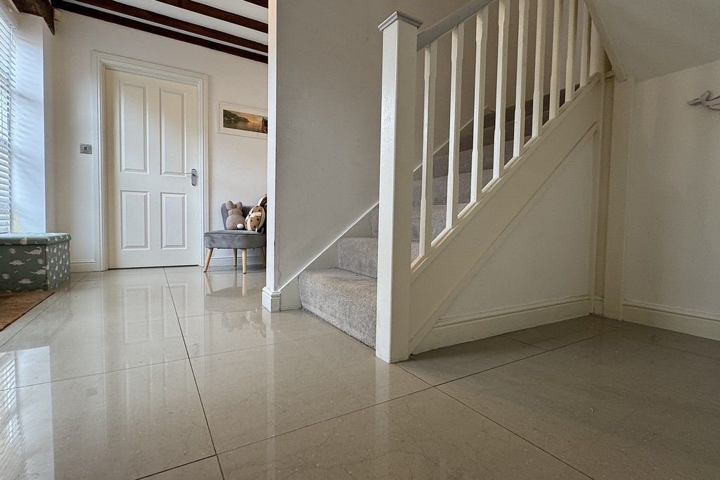 ENTRANCE HALL Entrance via a hardwood‑panelled front door with two picture windows, opening into a welcoming hallway with a staircase rising to the first‑floor landing. The space features exposed ceiling beams, a porcelain‑tiled floor, an alarm control panel and a wall‑mounted fuse box, with doors leading to the principal ground‑floor rooms