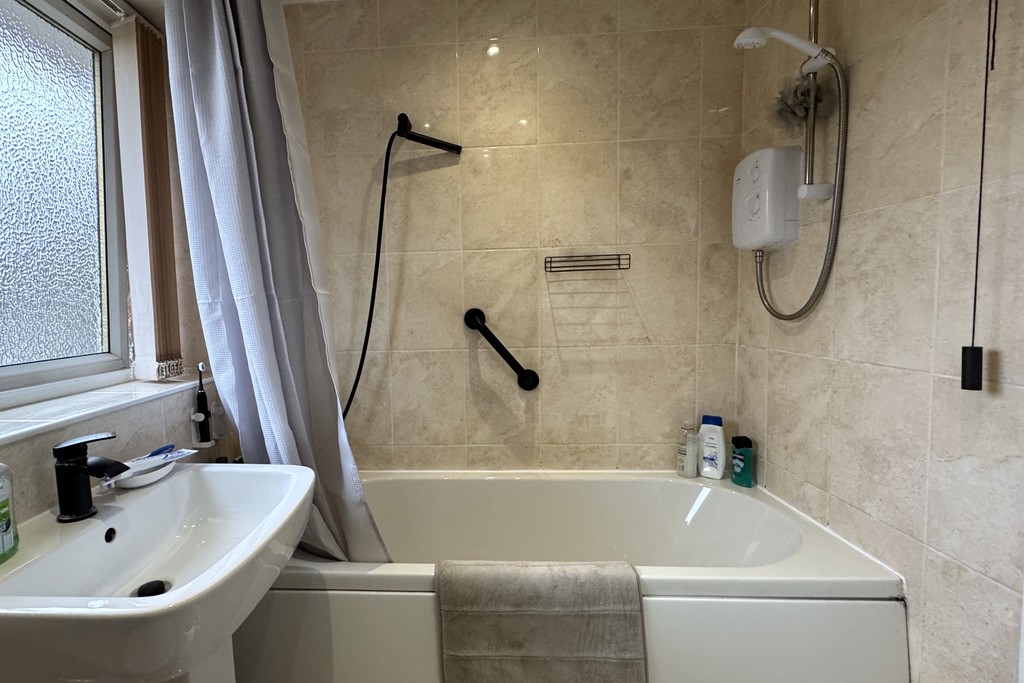 BATHROOM 5' 6" x 8' 5" (1.69m x 2.58m) Comprising of a panel bath with shower over, pedestal wash hand basin and a low flush WC. Obscure glazed window for privacy with fitted blinds, radiator, tiled walls and flooring.