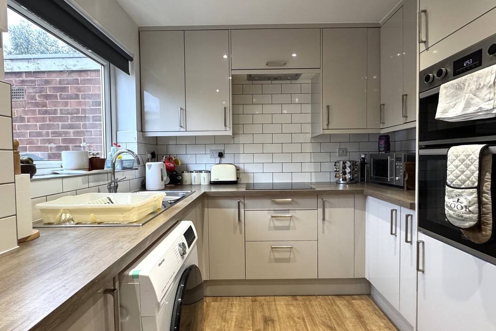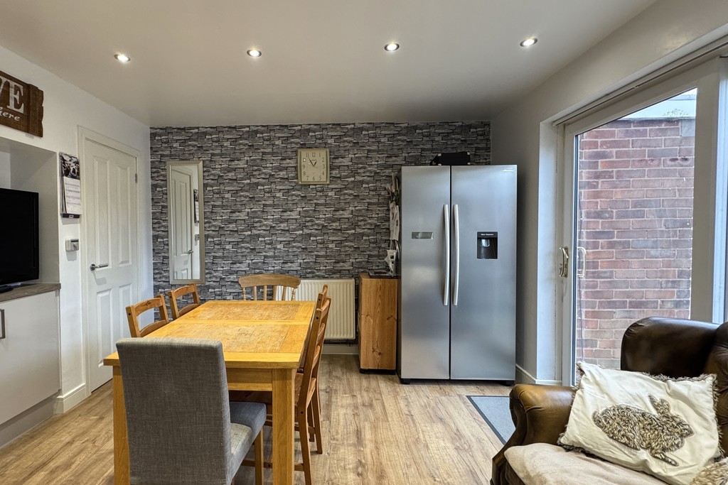 KITCHEN/DINER 12' 11" x 17' 7" (3.96m Max x 5.38m Max) Modern open-plan kitchen diner fitted with a range of contemporary wall, base and drawer units topped with work surfaces, stainless steel sink and drainer with mixer tap over, space and plumbing for a washing machine. Integrated eye level Beko double oven and grill and a Beko induction hob with extractor hood over. Window and patio doors to the garden, radiator, LED lighting, built-in storage cupboard, TV aerial point and laminate wood flooring.