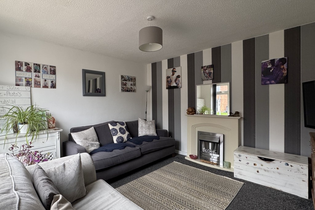 LOUNGE 11' 5" x 11' 11" (3.48m x 3.65m) Having a front facing window with fitted blinds, radiator, feature fireplace with electric fire, TV aerial point and carpet flooring.