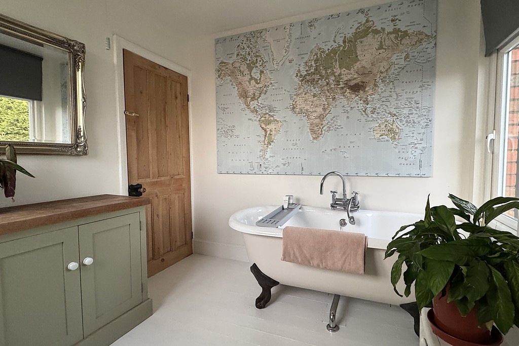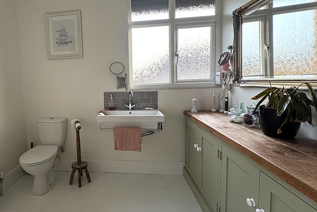 BATHROOM 8' 6" x 8' 9" (2.6m x 2.69m) Comprising of a roll top free standing bath with central tap and shower attachment, low flush WC and a wall mounted wash hand basin with towel rail. Dual aspect windows, fitted storage unit and wood flooring.