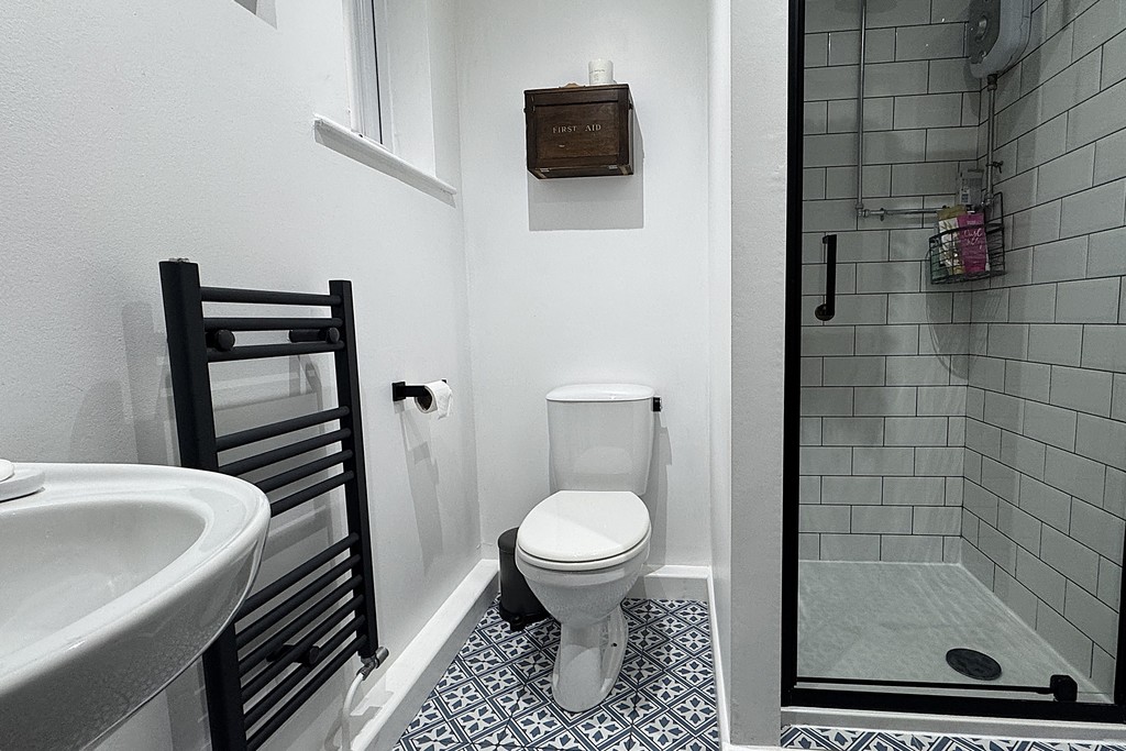 SHOWER ROOM 7' 4" x 5' 6" (2.25m x 1.68m) Comprising of a shower cubicle, low flush WC, pedestal wash hand basin and a heated towel rail. Obscure glazed window for privacy, LED lighting and tiled flooring.