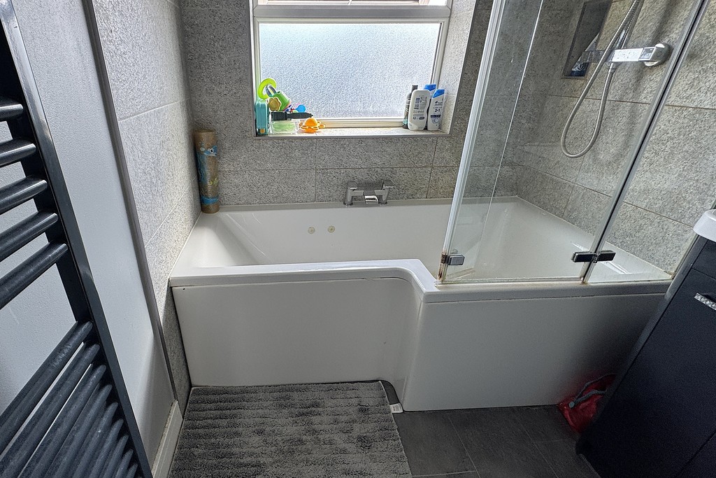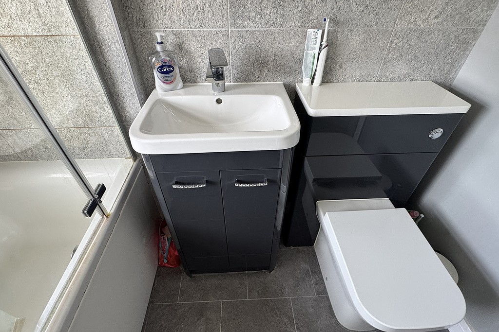 BATHROOM 5' 9" x 7' 11" (1.76m x 2.42m) Comprising a 'P'‑shaped panel bath with central mixer tap, shower over and glazed screen, this bathroom also features a vanity‑unit wash hand basin with fitted mirror above, low‑flush WC and a heated towel rail. Fully tiled walls, vinyl flooring, an extractor fan, LED lighting and an obscure glazed window for privacy.
