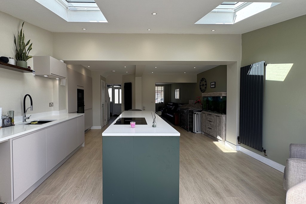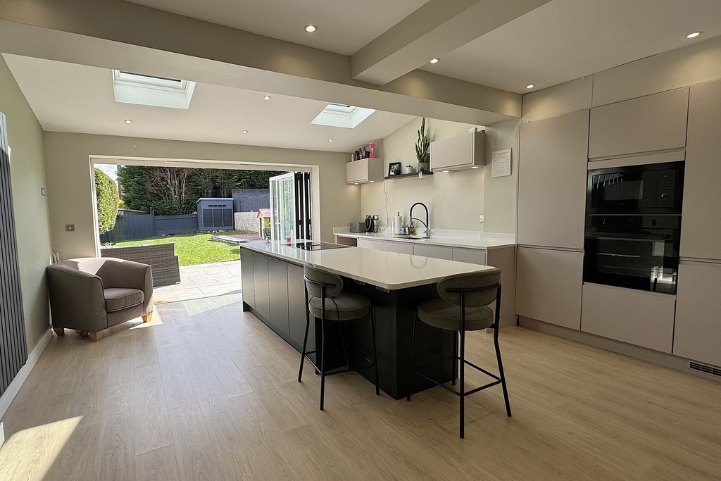 KITCHEN/DINER 14' 10" x 20' 4" (4.53m x 6.2m) Recently extended, this impressive open‑plan kitchen diner offers a modern, light‑filled space with bi‑fold doors opening onto the newly laid patio, creating an ideal setting for entertaining. Two Velux windows ensure natural light pours in throughout the day. The kitchen is fitted with sleek contemporary wall and base units topped with quartz work surfaces and an undermount sink, while a central island provides drawer storage, a breakfast bar and houses the AEG induction hob. Integrated AEG appliances include an eye‑level oven and microwave, fridge, freezer, dishwasher and washing machine, with space and venting for a tumble dryer. LED lighting, two vertical radiators and laminate wood flooring complete this stylish and practical space
