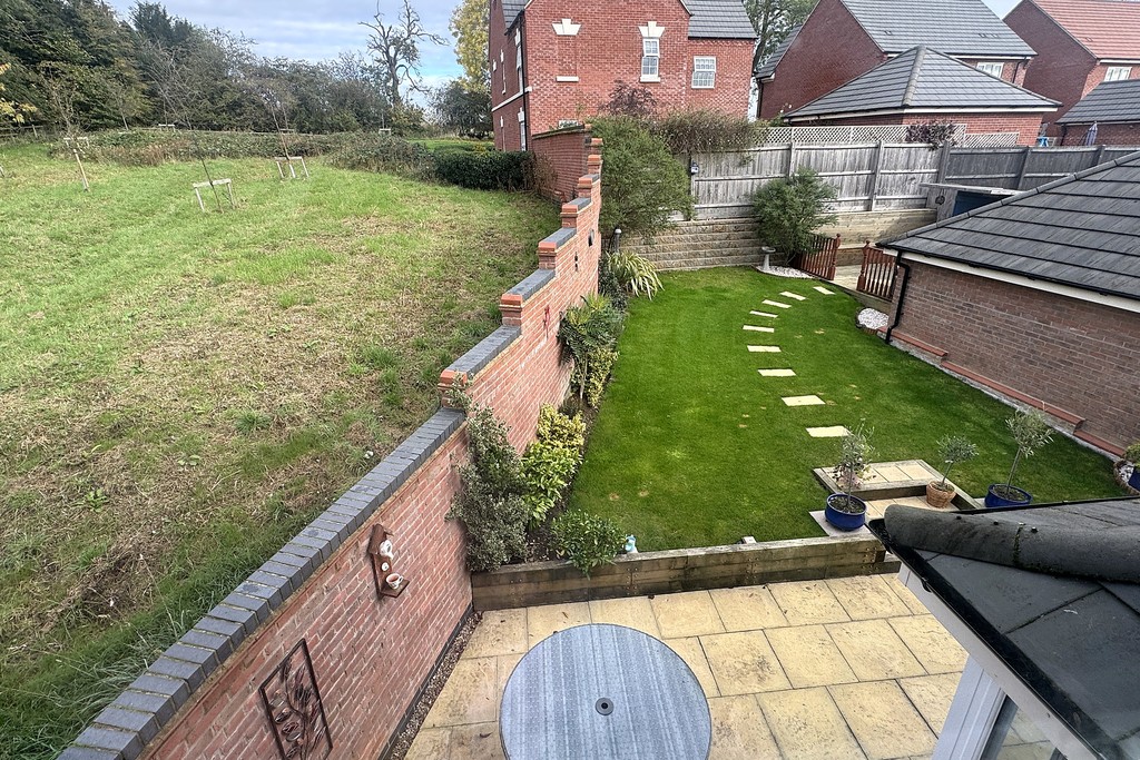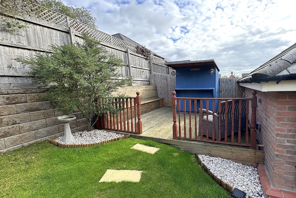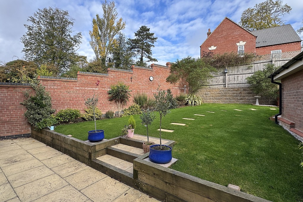 REAR GARDEN Beautifully landscaped for both relaxation and practicality, the rear garden features a paved patio area directly adjacent to the house, ideal for outdoor dining or morning coffee. A garden tap and double electric sockets add convenience, while steps lead up to a formal lawn bordered by thoughtfully planted beds. Tucked behind the garage, a private decked seating area enjoys the best of the day's sun, enhanced by courtesy lighting for evening ambience. Wood panel fencing and brick walling ensure privacy and security, with a gated access point leading back to the driveway.