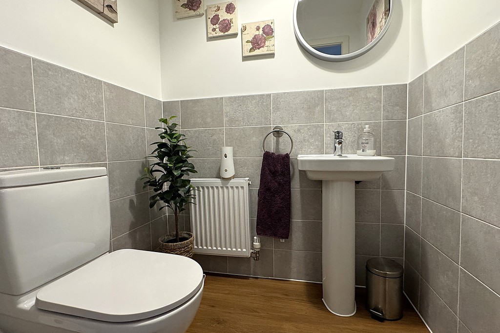 CLOAKROOM 4' 1" x 6' 9" (1.27m x 2.08m) Comprising a low flush WC, pedestal wash hand basin, radiator, and practical Amtico flooring.