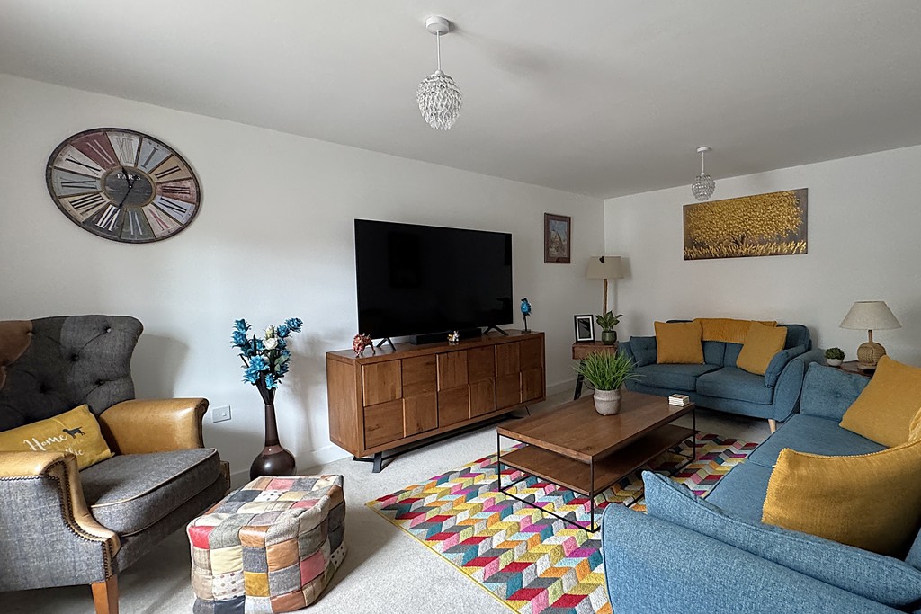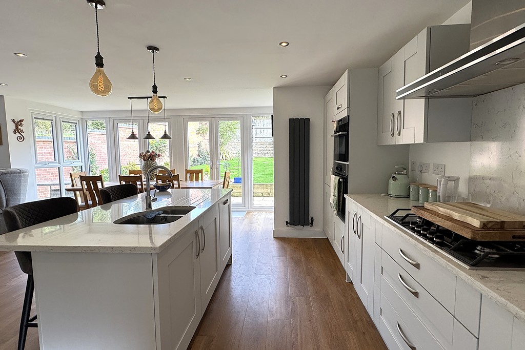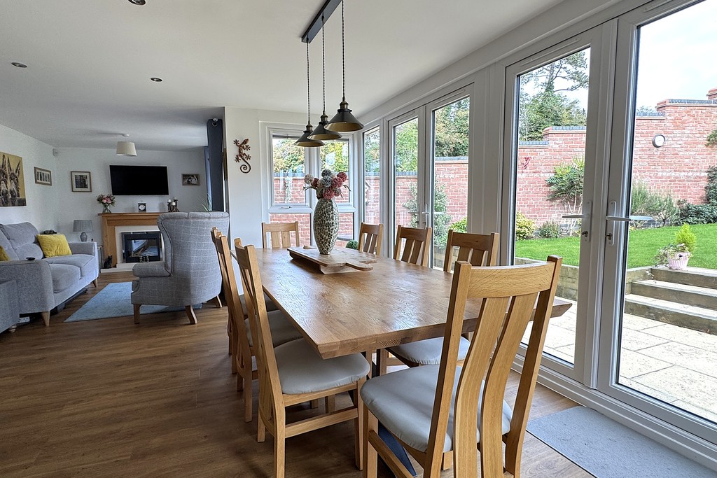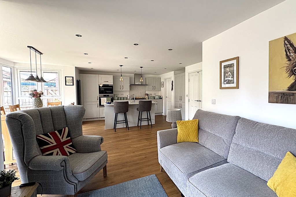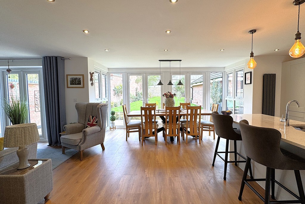 FAMILY AREA 12' 0" x 9' 4" (3.68m x 2.87m) A generous open-plan space designed for entertaining, offering ample room for both dining and relaxing. Double-glazed picture windows and French doors frame views of the rear garden and invite in natural light. The area is finished with Amtico flooring throughout, complemented by four radiators, a TV aerial point, and a door leading to the utility room.