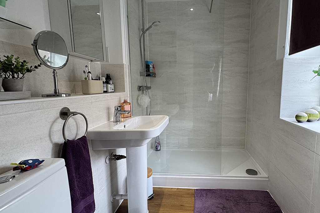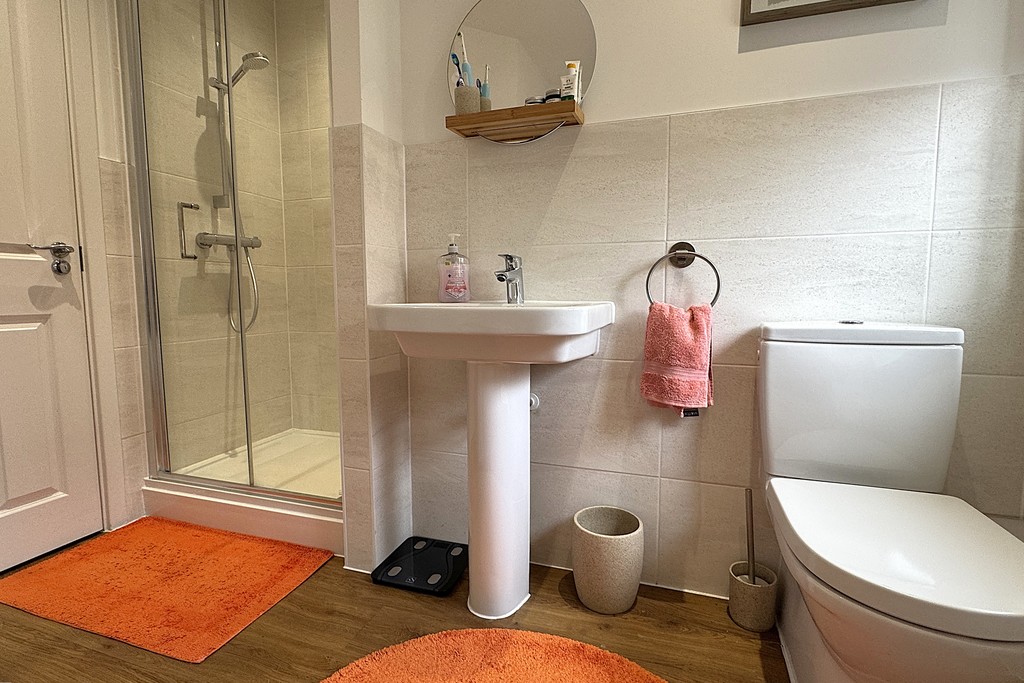 ENSUITE 8' 0" x 5' 8" (2.45m x 1.75m) Stylishly appointed with a walk-in shower cubicle, alongside a pedestal wash hand basin and low flush WC. Beveled tiling adds a touch of texture and sophistication, complemented by durable Amtico flooring underfoot. A heated towel ensures comfort, making this a practical yet polished private retreat.