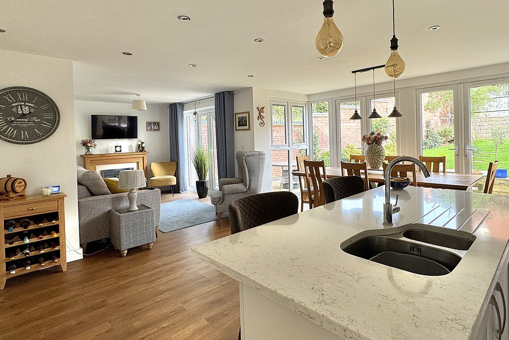 KITCHEN/DINER/LIVING 18' 5" x 18' 0" (5.62m x 5.51m) A generous open-plan space designed for entertaining, offering ample room for both dining and relaxing. Double-glazed picture windows and French doors frame views of the rear garden and invite in natural light. The area is finished with Amtico flooring throughout, complemented by four radiators, a TV aerial point, and a door leading to the utility room. The kitchen is fitted with a sleek, contemporary range of wall, base, and drawer units, topped with Quartz work surfaces and matching splash backs. A central island houses a stainless steel one and a half bowl sink with mixer tap, while integrated AEG appliances include an eye-level double oven, top oven/microwave, gas hob with extractor hood, fridge freezer, and dishwasher.