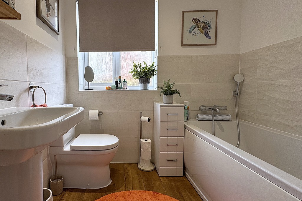 BATHROOM 8' 10" x 6' 9" (2.71m x 2.08m) Beautifully appointed with both a paneled bath featuring a shower attachment and a separate shower cubicle with riser, pedestal wash hand basin and low flush WC. The space is finished with durable Amtico flooring, a heated towel rail for comfort, beveled tiling and an obscure glazed window for natural light and privacy.