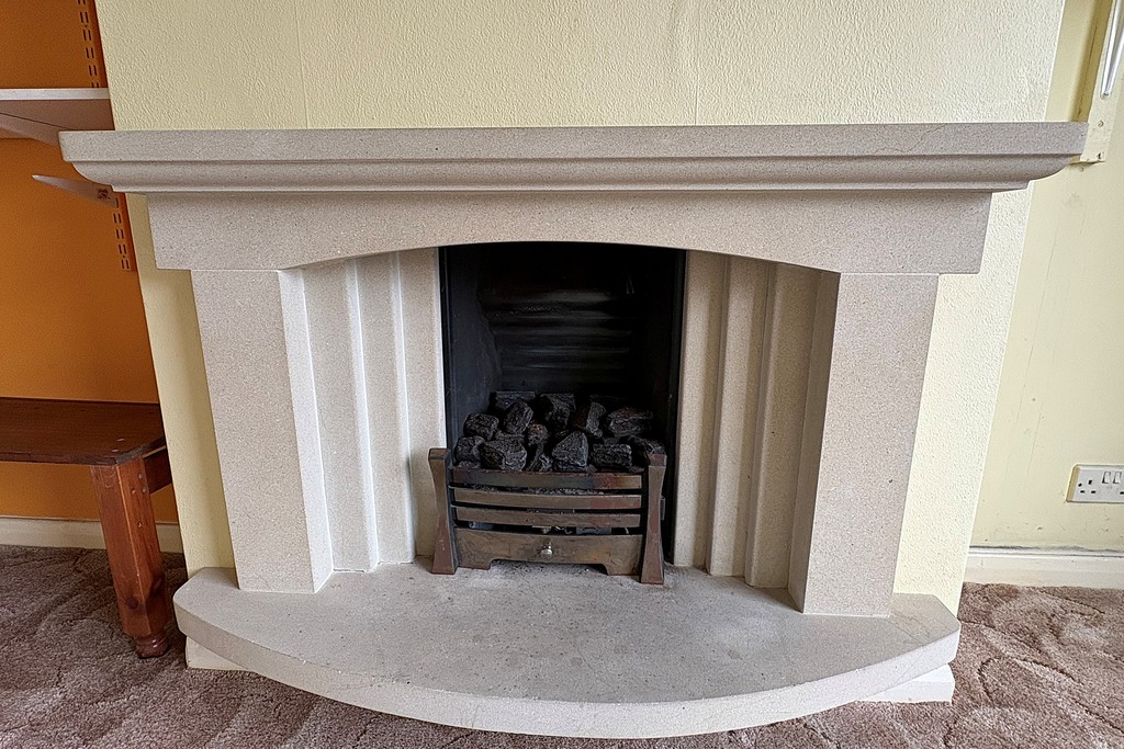 LOUNGE 12' 7" x 9' 9" (3.86m x 2.99m) Having a large front facing window, feature stone fireplace with gas fire, TV aerial point, shelving to the alcove, carpet flooring and opening through to the dining area.