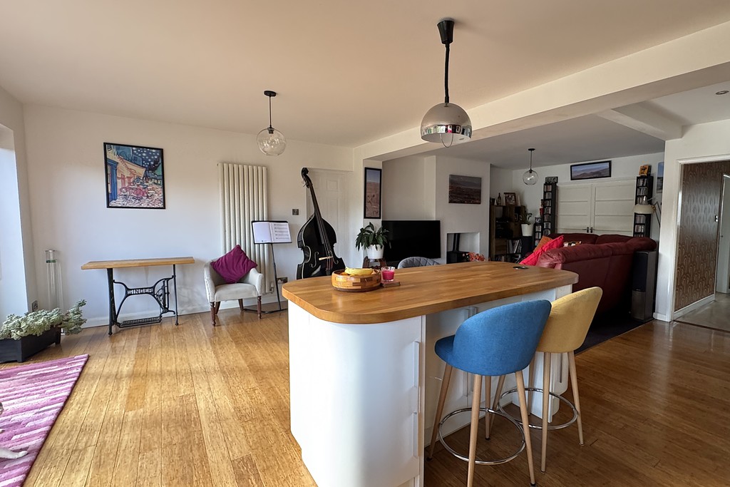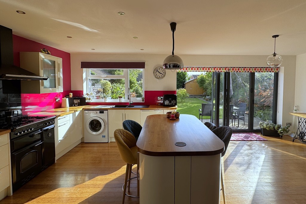 LOUNGE/KITCHEN/DINER 26' 10" x 21' 9" (8.2m reducing to 6.30m x 6.64m reducing to 3.78m) A modern open-plan kitchen diner with a cozy lounge area and bi-fold doors opening the space up the the south facing garden creating a great space for the family to enjoy. The kitchen is fitted with modern sleek wall,, base and drawer units topped with durable wood work surfaces, a Lamona sink and drainer unit with flexi-hose mixer tap sits beneath a window over looking the garden. Space and plumbing for a washing machine, an integrated dishwasher and a Gas Range master cooker with extractor hood over. A central island with space to seat four with a pop-up electrical socket for handy phone charging. Inset LED lighting and three pendant lights, vertical radiator and Bamboo wood flooring. The lounge area has a multi-fuel log burning stove and carpet flooring for cozy evenings, TV aerial point and french doors to the sitting room.