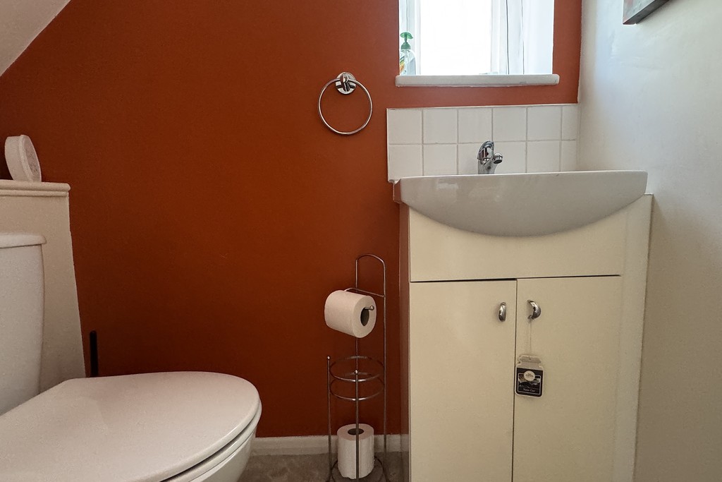 CLOAKROOM 5' 7" x 2' 11" (1.72m x 0.91m) Comprising of a dual flush WC and vanity unit wash hand basin, obscure glazed window and carpet flooring.