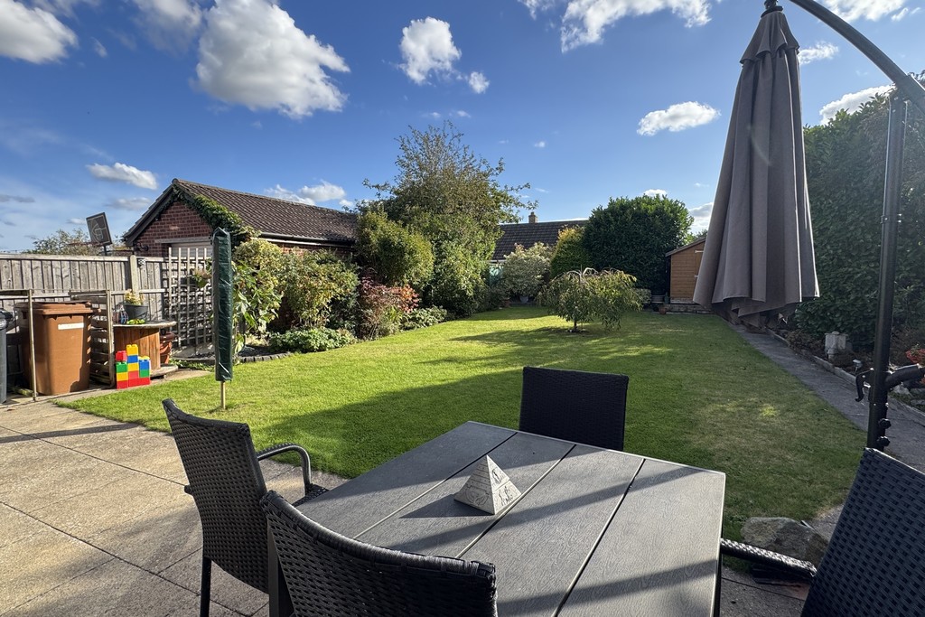 REAR GARDEN The generous south facing garden has a paved patio adjacent to the property, garden tap and outdoor electrical sockets for convenience. A formal lawn with borders of mature shrubs and a paved pathway leads to a garden shed. Wood panel fencing secures the boundary and a side gate gives access to the front.