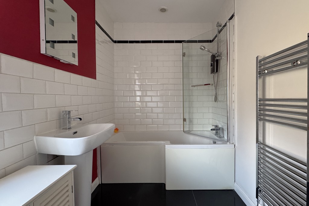 BATHROOM 10' 9" x 5' 8" (3.28m x 1.73m) Comprising of a bath with a shower over and a folding shower screen, pedestal wash hand basin heated towel rail and a dual flush WC. Obscure glazed window dressed with a roller blind, extractor fan, part tiled walls and tiled flooring.