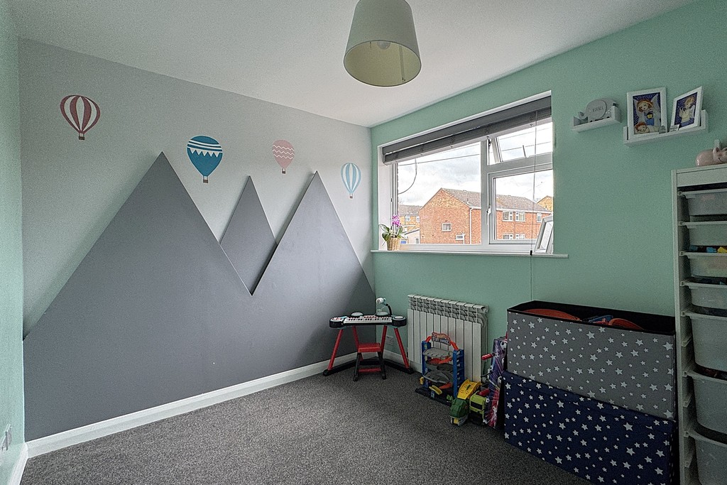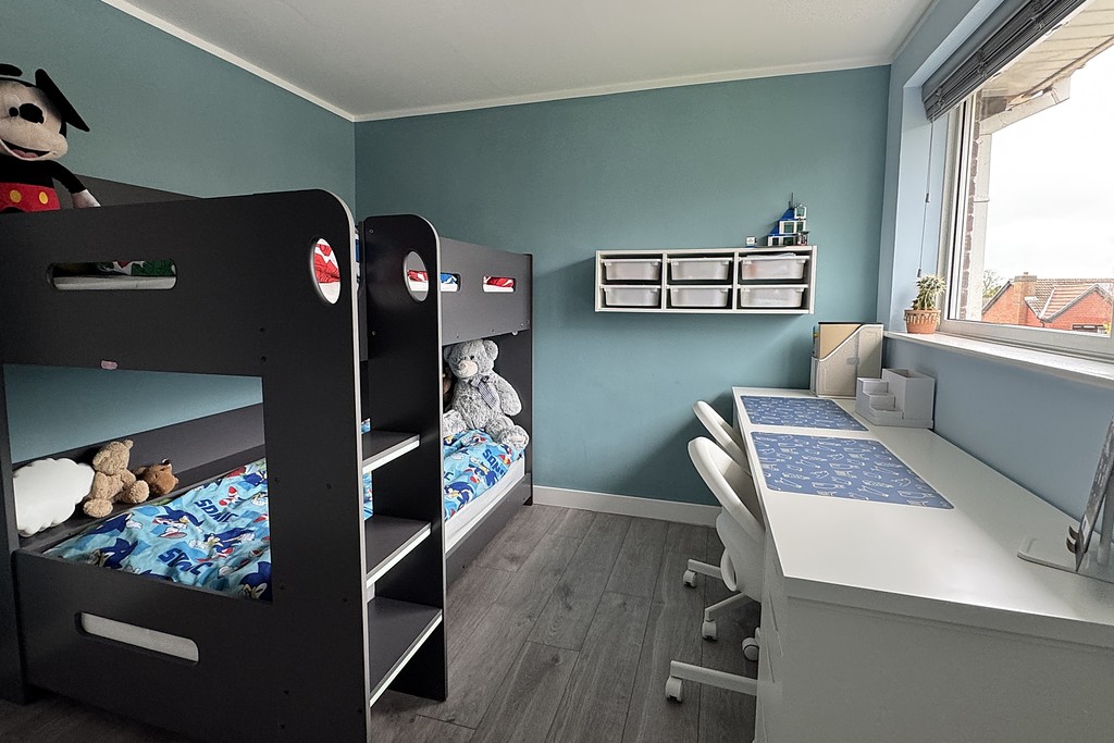 BEDROOM THREE 7' 11" x 11' 2" (2.43m x 3.41m) Having a rear facing window with fitted blind, radiator, built-in shelving and drawers and laminate wood flooring.