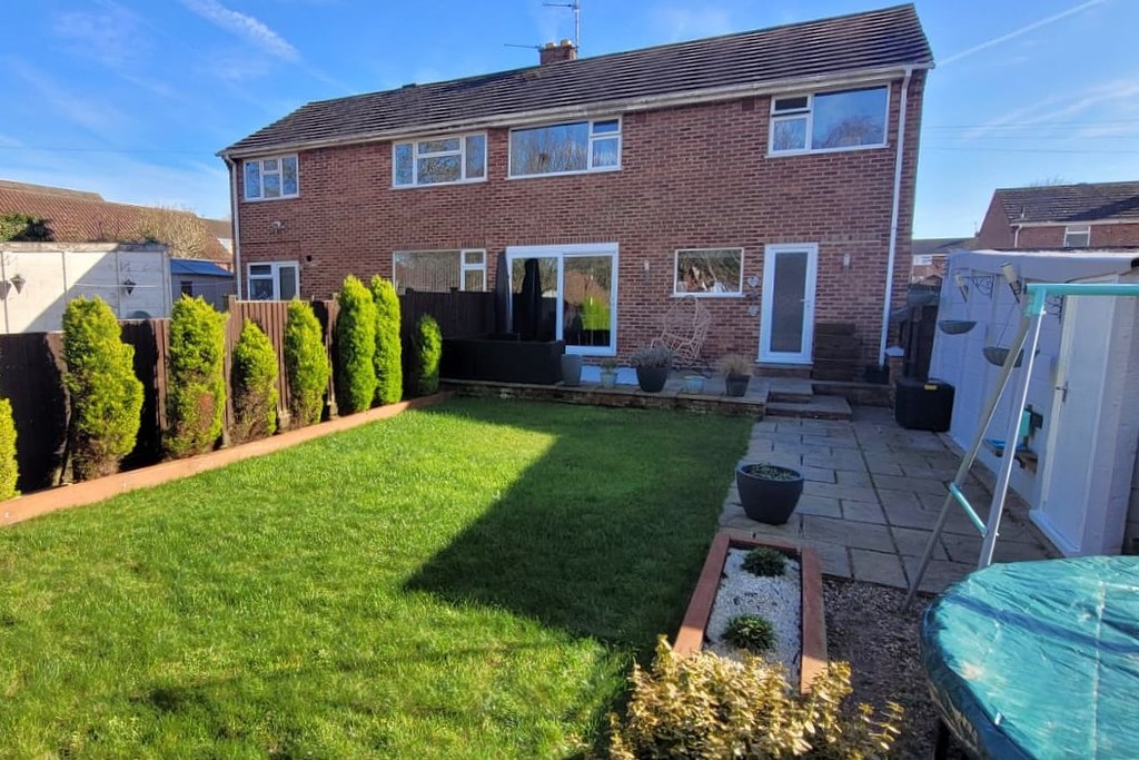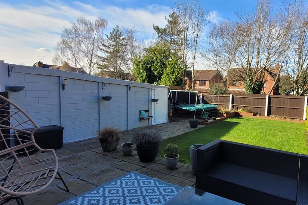 REAR GARDEN Having a paved patio adjacent to the house and extending down the garden framing the lawn. Mature shrubs to the borders, Garden tap and a trampoline space to the rear of the garage.