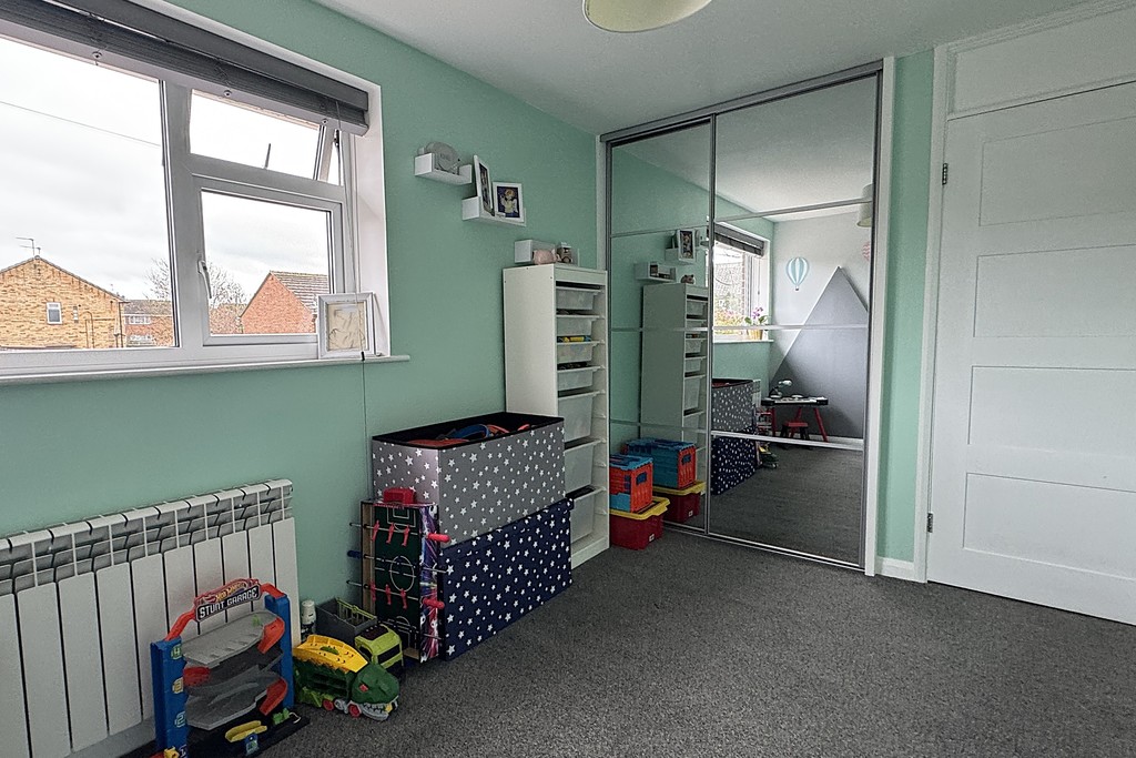 BEDROOM TWO 9' 3" x 11' 3" (2.82m x 3.43m) Having a front facing window with fitted blind, radiator, built in mirrored wardrobe and carpet flooring.