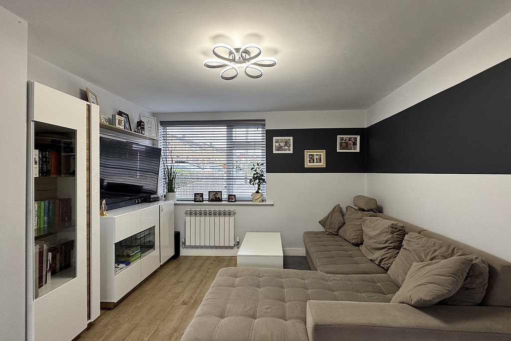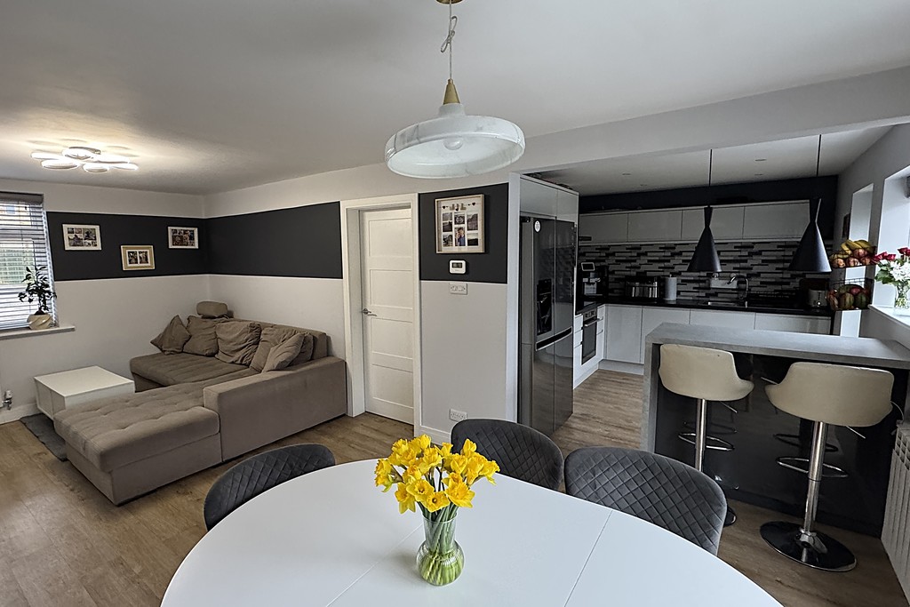 LOUNGE DINER 11' 1" x 21' 8" (3.39m x 6.61m) An inviting open‑plan lounge-diner featuring a front-facing window and patio doors to the rear garden, both fitted with sleek blinds to control light and privacy. This generous dual‑aspect layout creates a bright, versatile space ideal for relaxing or entertaining. The room includes two radiators, a TV aerial point, and Karndean flooring that flows seamlessly through to the kitchen.