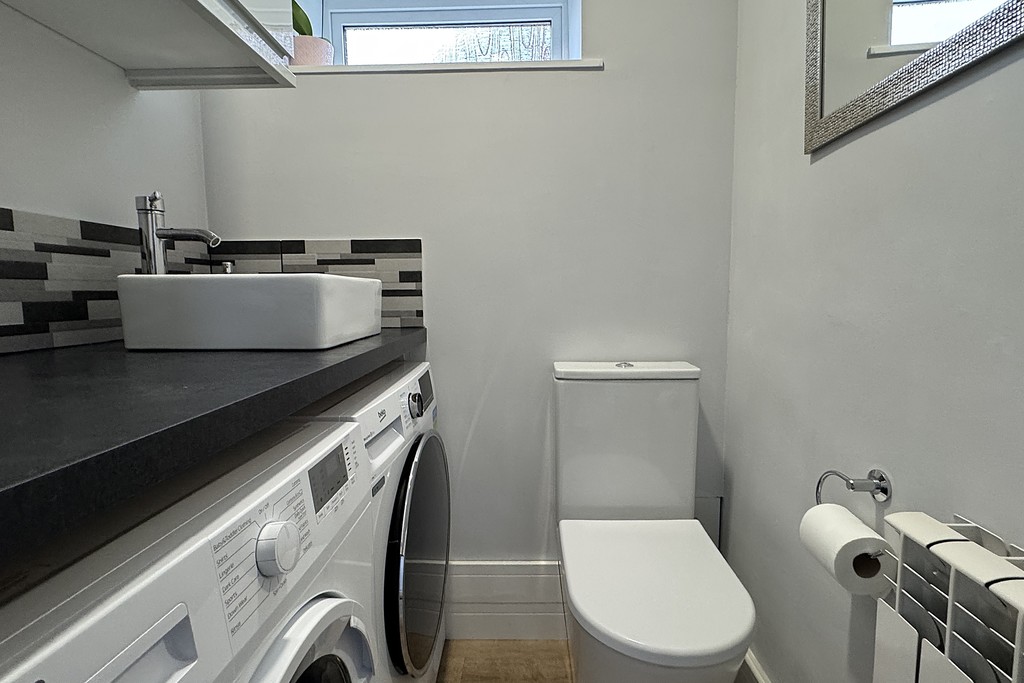 UTILITY ROOM/WC 4' 9" x 4' 0" (1.45m x 1.23m) Comprising of a wall mounted cupboard, fitted worktop with wash hand basin, space and plumbing a washing machine and tumble dryer, low flush W.C, tiled splash areas and Kardean flooring.