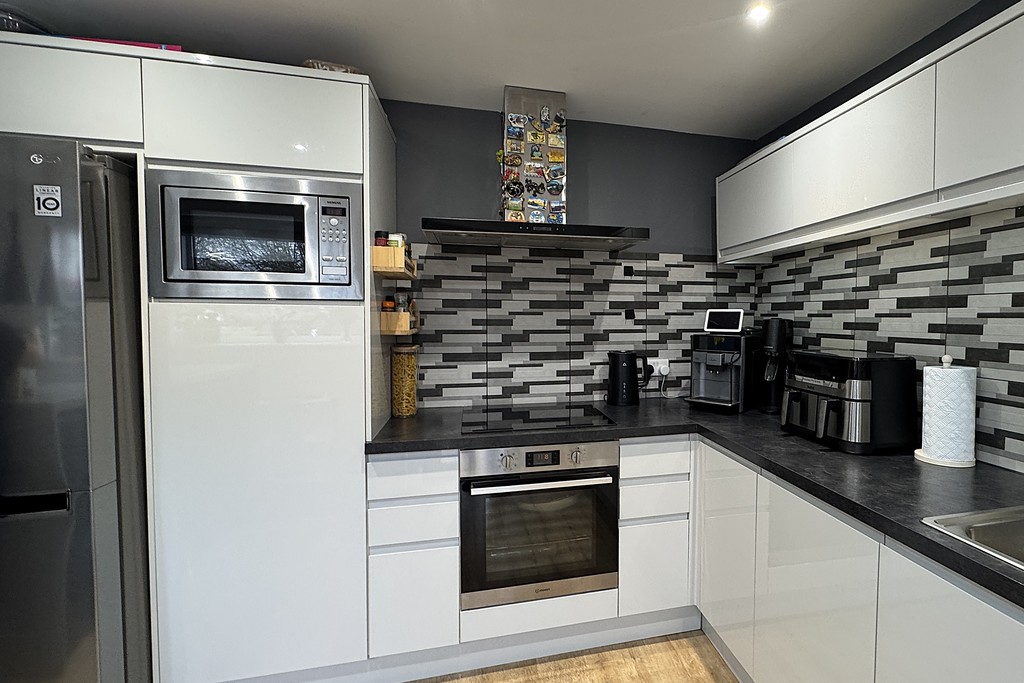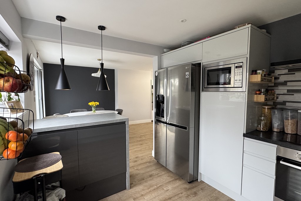 KITCHEN/BREAKFAST ROOM 9' 8" x 11' 5" (2.97m x 3.5m) Fitted with a sleek range of wall, base and drawer units topped with work surfaces, breakfast bar, stainless steel sink and drainer with mixer tap over, housing for an American fridge freezer,. Integrated Indesit electric cooker, Samsung induction hob with extractor over, dishwasher and an integrated microwave. Tiled walls, inset LED lighting, window and external door to the rear garden.