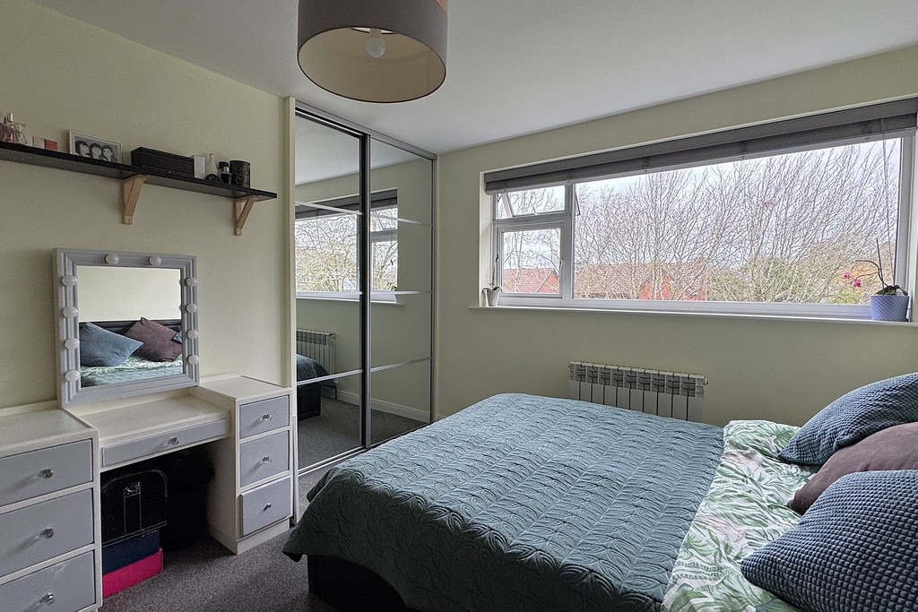 BEDROOM ONE 12' 6" x 11' 3" (3.83m x 3.45m) Double bedroom with a rear facing window with fitted blind, radiator, built in mirrored wardrobe and carpet flooring.