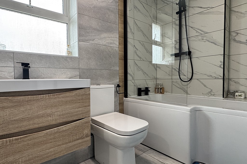BATHROOM 4' 9" x 9' 2" (1.45m x 2.8m) Comprising of a panel bath with a waterfall shower over complimented with a glazed shower screen, low flush WC, vanity unit wash hand basin with drawer storage and a heated towel rail. Obscure glazed window for privacy, extractor fan, fully tiled walls and floor.