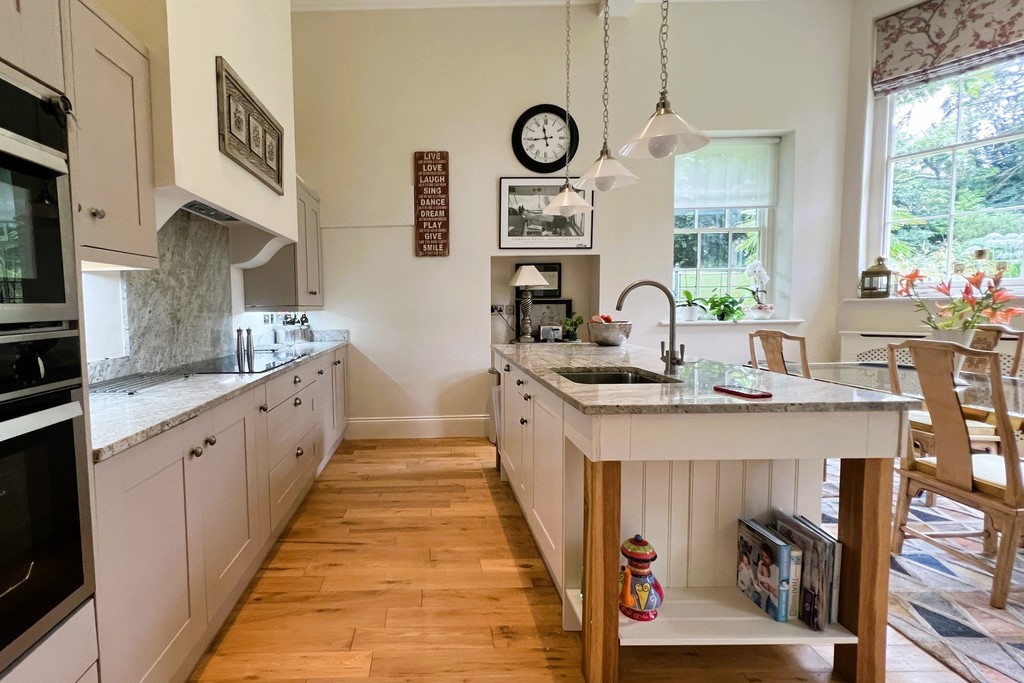 SITTING ROOM 20' 9" x 24' 9" (6.35m x 7.55m) This beautiful sitting room benefits from large sash windows with original shutters and a glazed door opening onto the patio, gas fired wood burner and two radiators making this a great space to sit and relax all year round. Having high ceilings with decorative period coving, half wood paneled walls and a sweeping grand staircase to the first floor and solid oak wood flooring throughout. Double glazed doors lead to the kitchen diner.