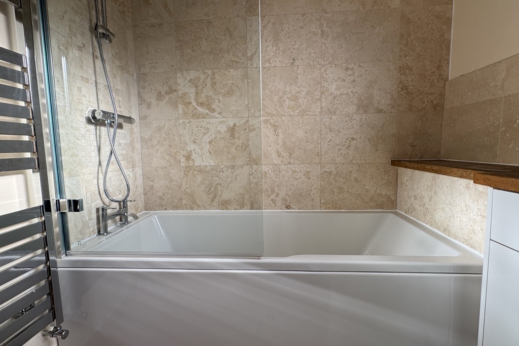 BATHROOM Comprising of a panel bath with shower over complimented with a glazed shower screen, low flush WC, pedestal wash hand basin and a heated towel rail. Obscure glazed window for privacy, part tiled walls and tiled flooring.