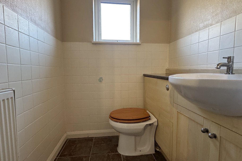 CLOAKROOM 4' 9" x 4' 9" (1.46m x 1.47m) Having an obscure glazed window for privacy, vanity unit wash hand basin and close coupled WC, radiator and tiled flooring.