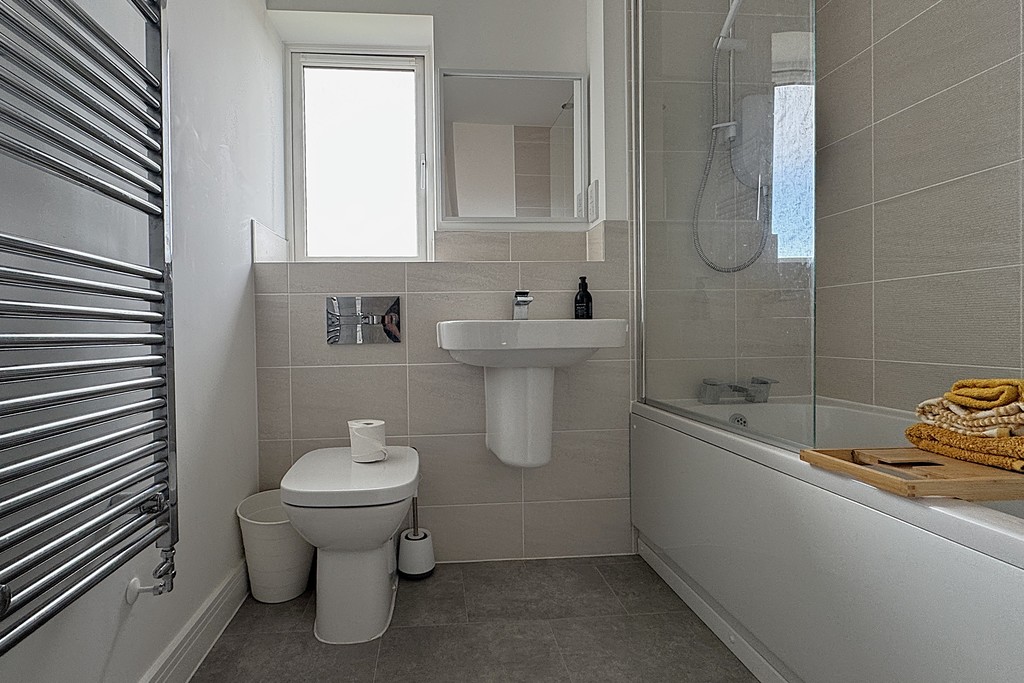 BATHROOM 9' 0" x 6' 7" (2.76m x 2.02m) Comprising of a panel bath with shower riser over and glazed shower screen, dual flush WC, wall mounted wash hand basin and a heated towel rail. Obscure glazed window for privacy, extractor fan, inset LED lighting part tiled walls and vinyl flooring.