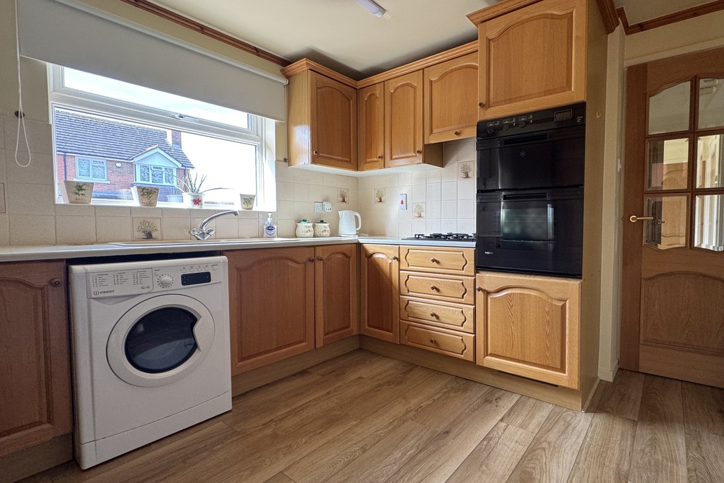 KITCHEN 10' 0" x 11' 1" (3.05m x 3.38m) Fitted with a range of Oak wall base and drawer units topped with work surfaces, sink with drainer, space and plumbing for a washing machine. Integrated, eye level Creda electric double oven and grill, gas hob with pull out extractor hood over. Front facing window, external door to the garden, space for a fridge freezer and laminate wood flooring.