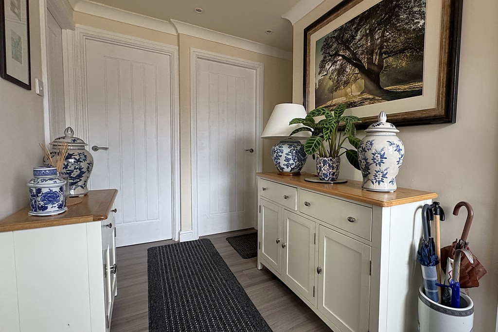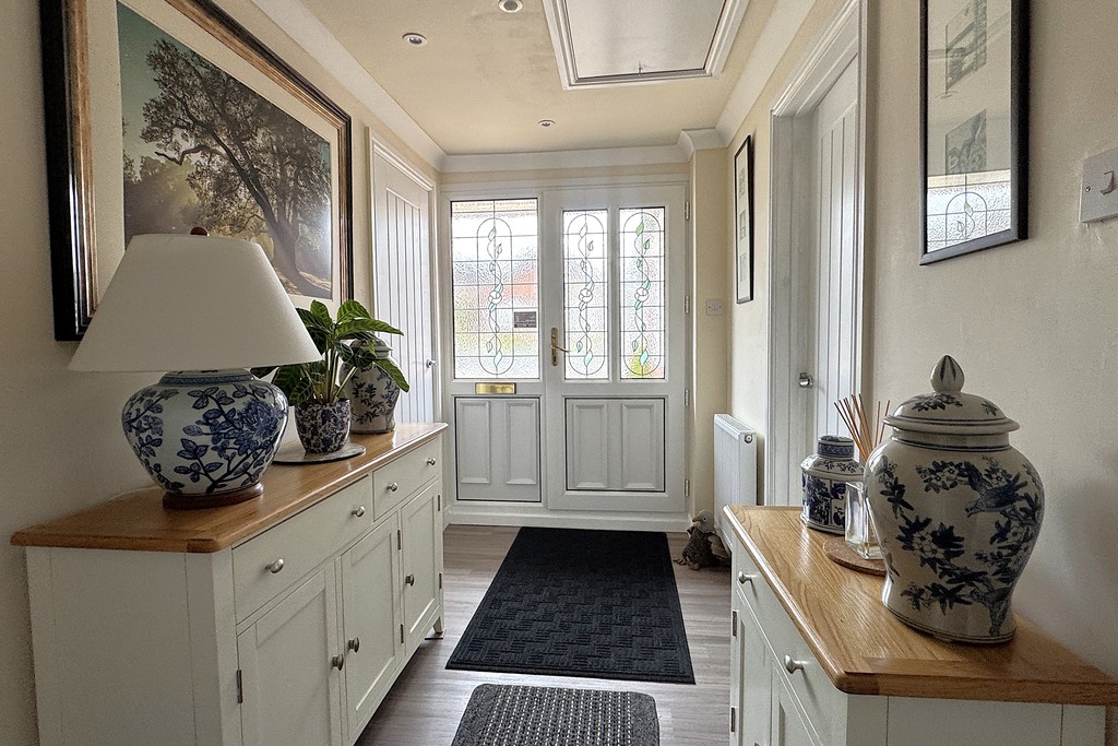 ENTRANCE HALL A part-glazed door with matching glazed side panel opens into a bright and inviting entrance hall. Having a handy built-in storage cupboard, radiator, and laminate wood flooring underfoot. From here, doors lead off to the main living areas.