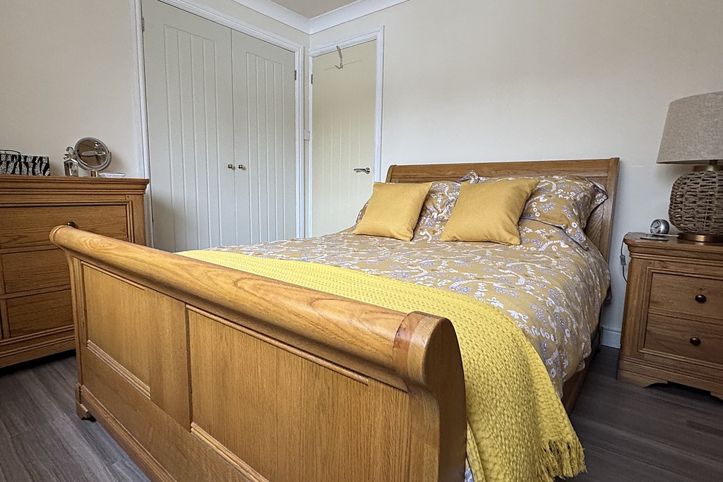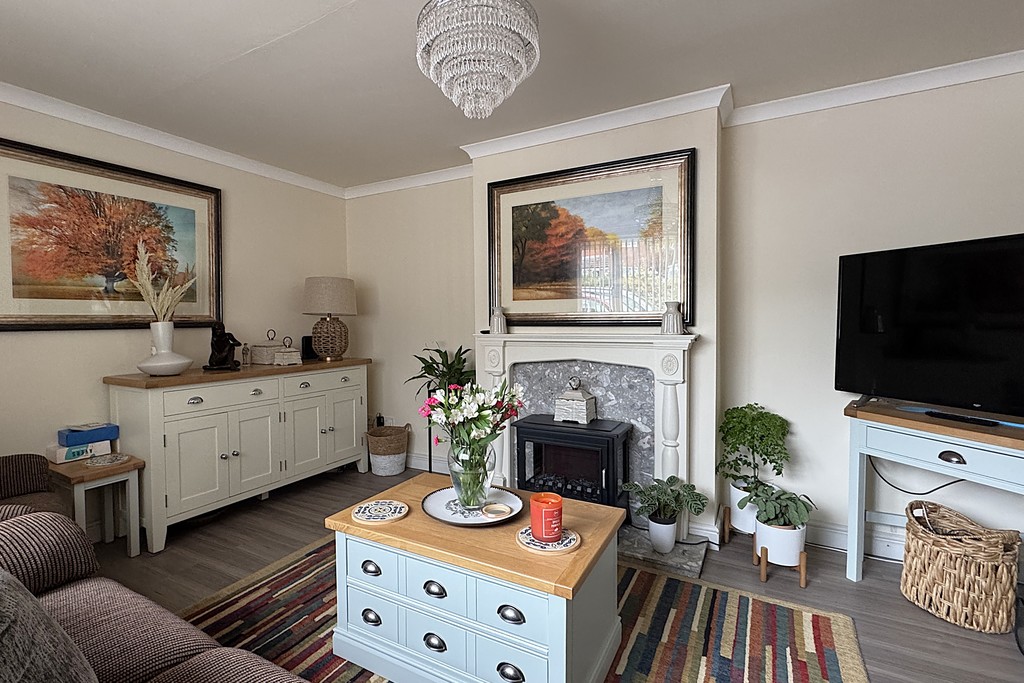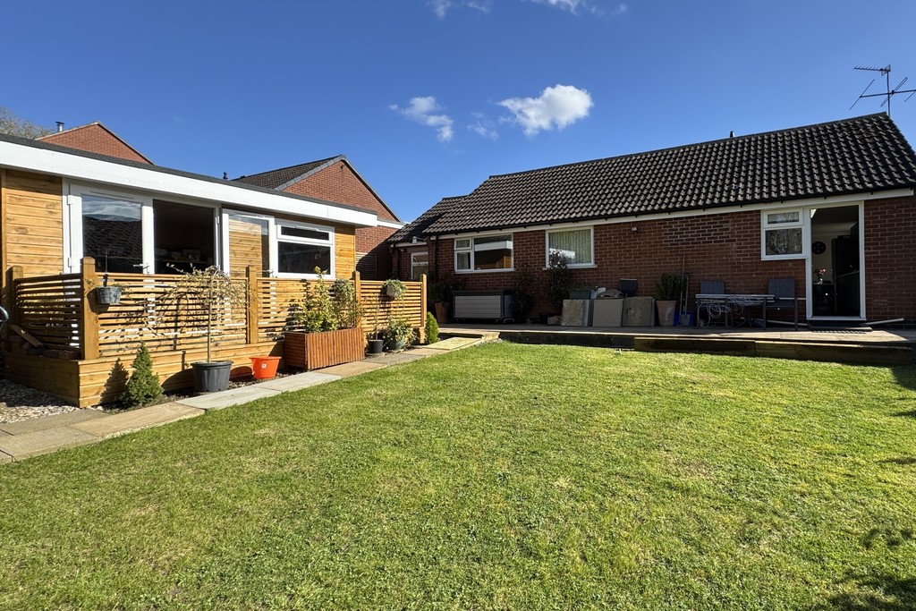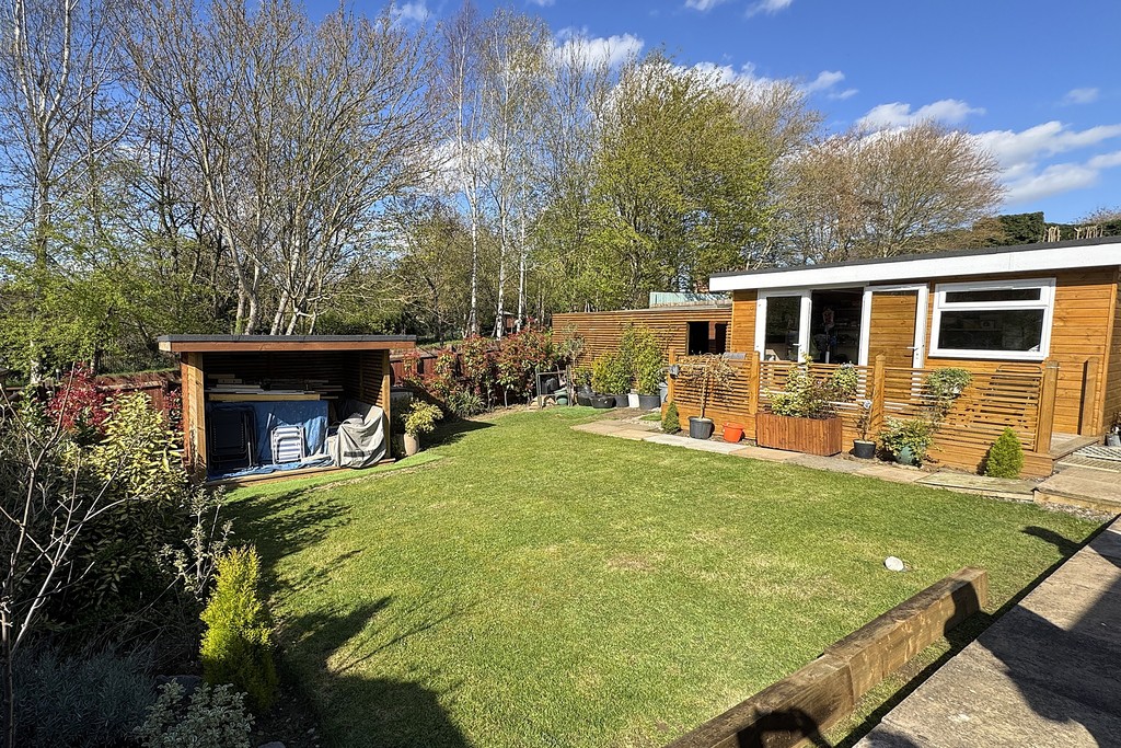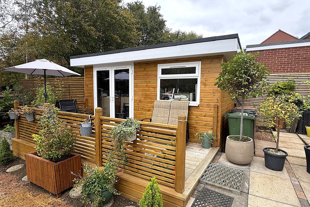 REAR GARDEN This private garden has a lovely backdrop of trees creating a relaxing space to enjoy. A paved patio area adjacent to the bungalow benefits from courtesy lighting, water tap and electrical sockets. The stylish garden room offers a versatile space, ideal for a home office, creative studio, or tranquil escape with a surrounding decked area. Formal lawn with shrub borders and raised vegetable beds and an open-fronted timber seating area at the bottom of the lawn ensures enjoyment all year round.