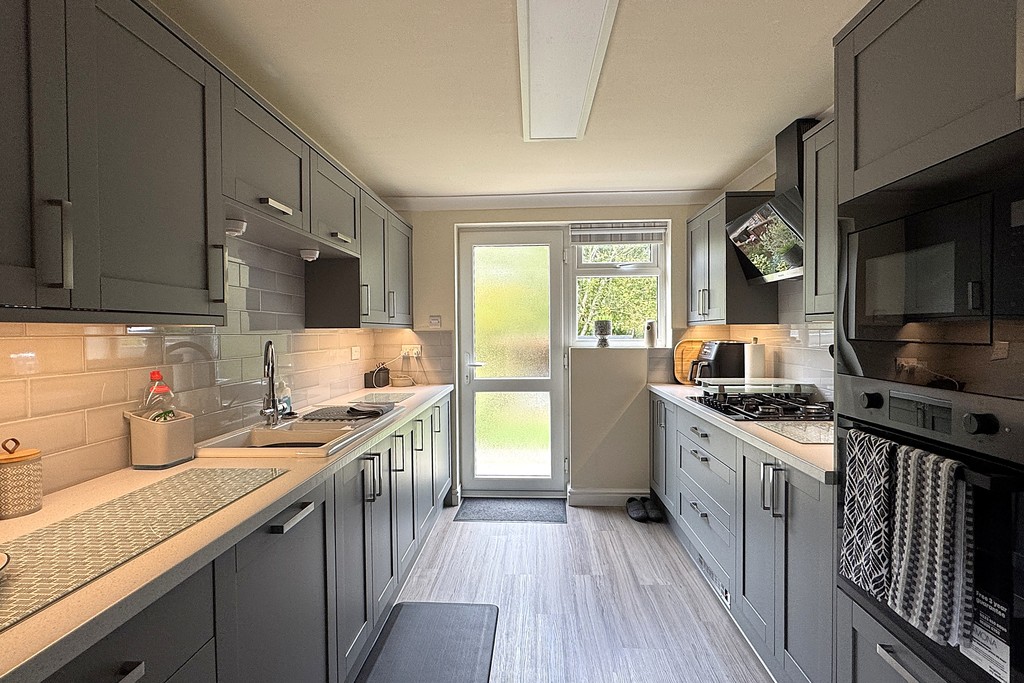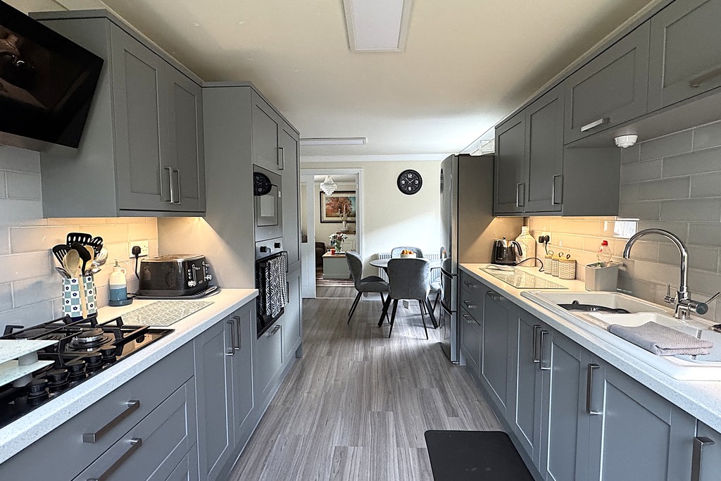 KITCHEN 8' 9" x 11' 8" (2.68m x 3.58m) Newly fitted with modern wall, base and drawer units topped with work surfaces and under unit lighting. Ceramic one and a half bowl sink and drainer unit, integrated appliances comprise of a dishwasher, microwave, eye level oven and a gas hob with extractor hood over. Window and external door to the rear garden, kick board heating, strip lighting and laminate wood flooring continuing through to the dining area.