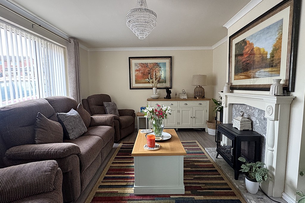 LOUNGE 14' 4" x 11' 8" (4.38m x 3.58m) Having a front facing window with fitted blind, radiator, feature fireplace, TV aerial point and laminate wood flooring.