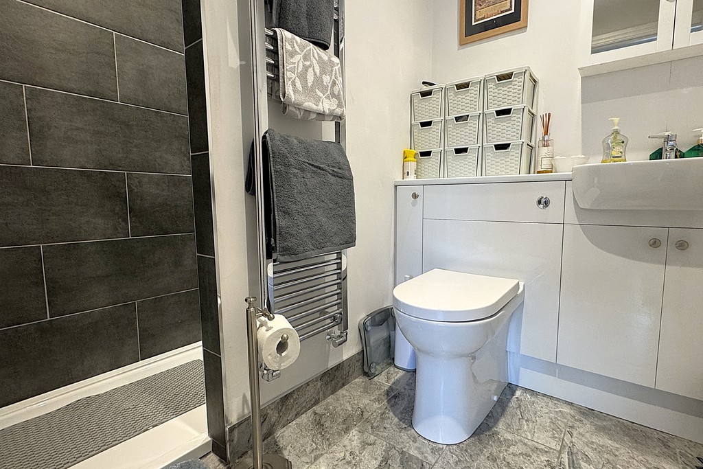 SHOWER ROOM 6' 2" x 7' 5" (1.9m x 2.27m) Comprising of a walk-in shower cubicle, vanity unit wash hand basin and close coupled dual flush WC. Heated towel rail, wall mounted heater, extractor fans, LED lighting and tiled flooring.