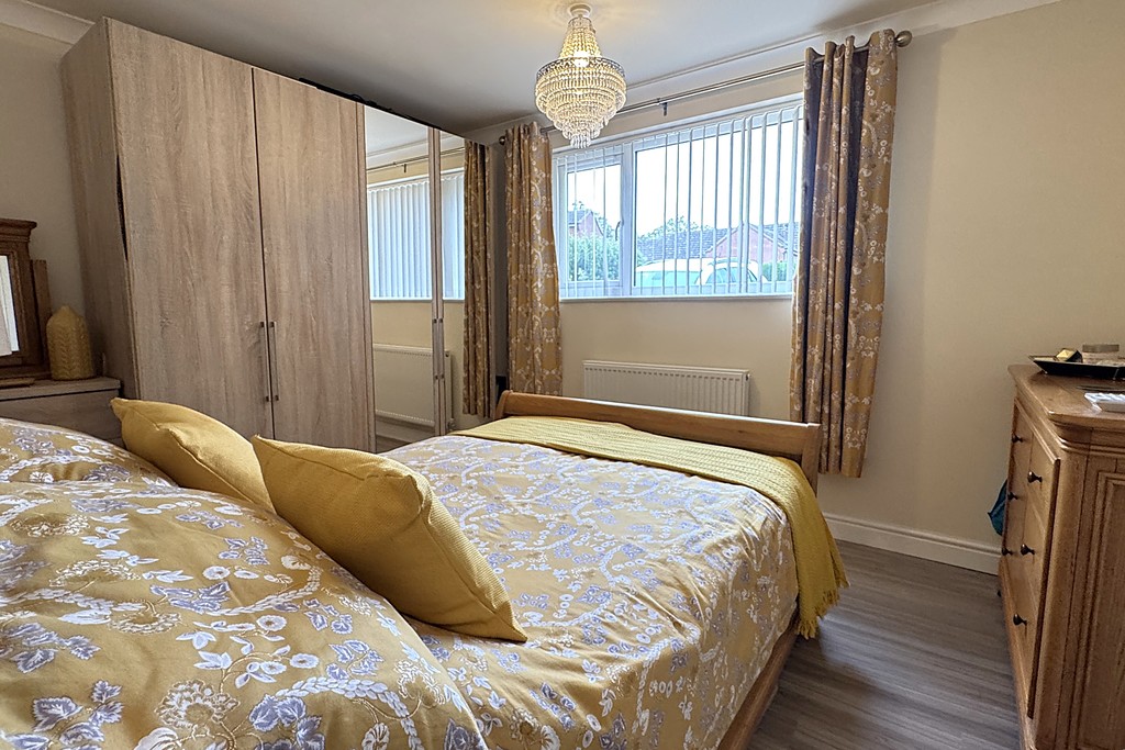 BEDROOM ONE 9' 9" x 12' 5" (2.98m x 3.8m) Having a front facing window with a fitted blind, radiator, fitted wardrobes and laminate wood flooring.