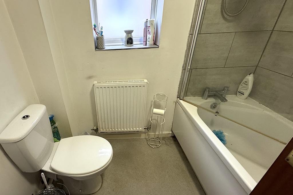 BATHROOM 3' 3" x 6' 7" (1..68m x 2.01m) Comprising of a panel bath with shower over complemented with a glazed screen, pedestal wash hand basin and a low flush WC. Obscure glazed window for privacy, radiator, part tiled walls and vinyl flooring.