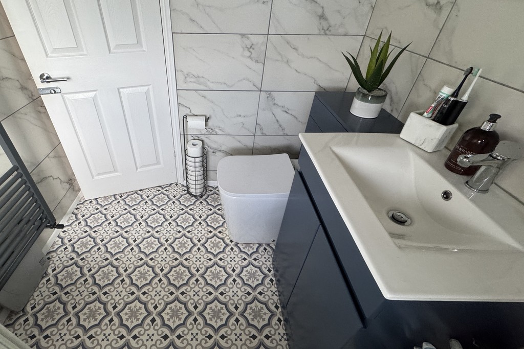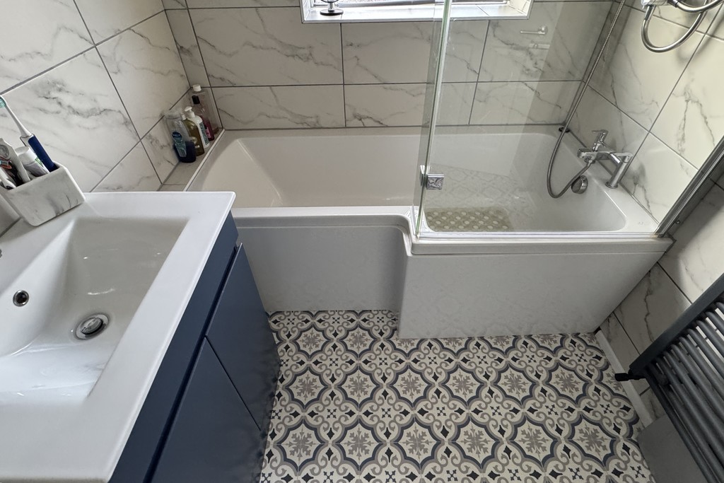 BATHROOM 5' 10" x 7' 2" (1.78m x 2.2m) Comprising of a panel bath with a fixed waterfall shower and shower riser complemented with a glazed screen, vanity unit wash hand basin, close coupled, dual flush WC and a heated towel rail. Obscure glazed window with fitted blind for privacy, tiled walls and cushioned vinyl flooring.