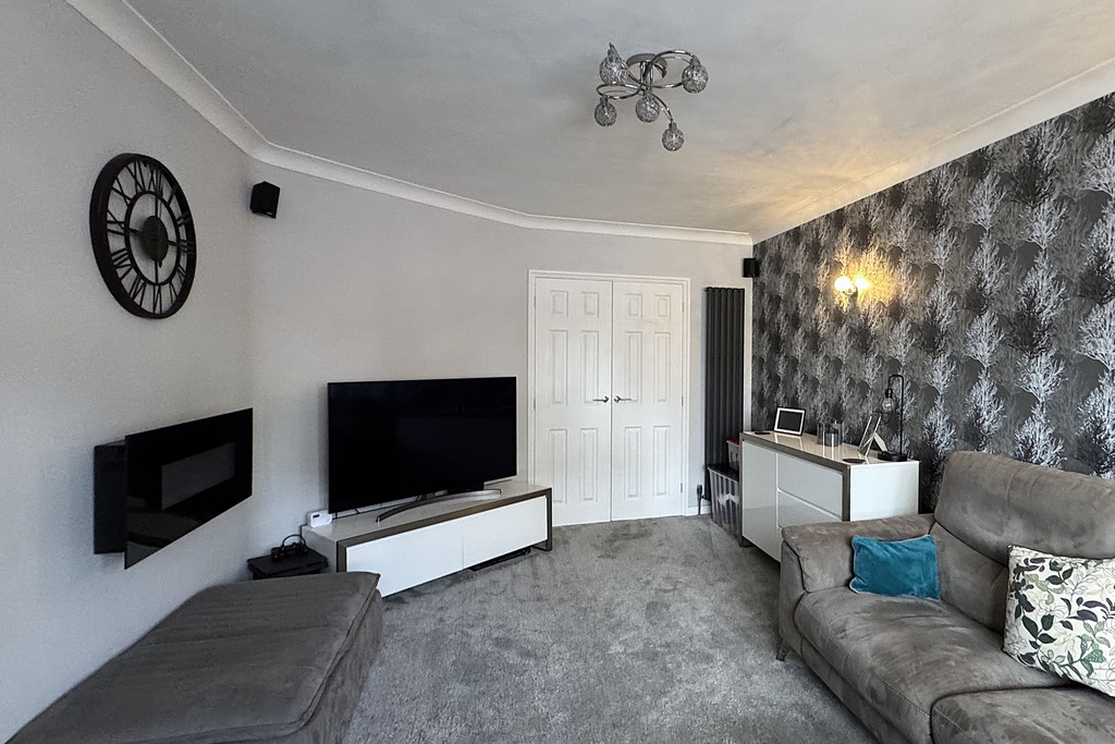 LOUNGE 10' 11" x 17' 0" (3.35m x 5.2m) Having a front facing window with a fitted blind, two vertical radiators, wall mounted fire, TV aerial point, built-in speakers, carpet flooring and French doors through to the dining room.